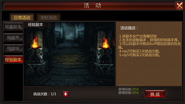当玩家达到40级后,将开启一项活动——【除魔副本】。《荣耀战争》中,【除魔副本】是每位玩家每日必参与的活动之一,除了丰厚的经验奖励外,还有丰富的物品回馈。该副本在40级时开启,每10级会解锁一个新副本。副本分为个人和两种挑战方式,组队副本的难度较高,当然,回报也更加丰厚。每个【除魔副本】中都有众多小怪和一个BOSS,击杀副本中的所有怪物即可通关并获得大量经验。