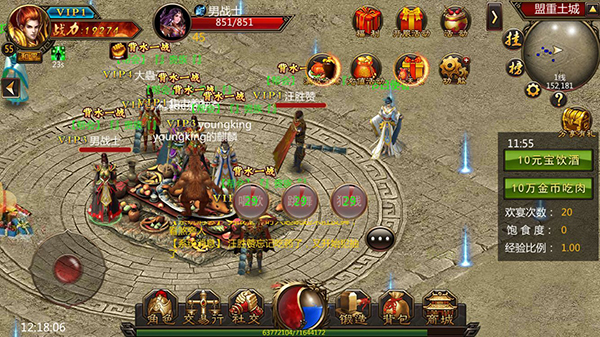 《荣耀战争》中还有一项极为轻松的活动,即每天中午12:10在土城准时开启的【满汉全席】!参与该活动的玩家需在45级以上。在活动中,你只需站在土城的安全区内,即可自动获得经验,并可通过“饮酒”“吃肉”增加饱食度,饱食度越高,获得的经验加成也越显著,饱食度的提升需使用元宝或银币购买。