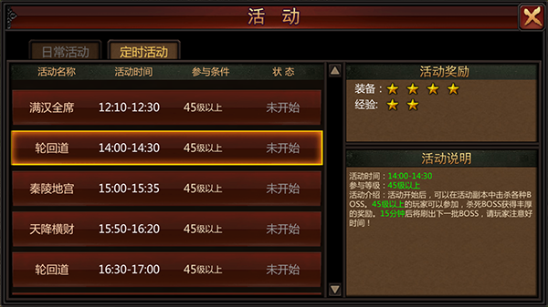 首先谈谈【轮回道】活动,分别有、人道、阿修罗、地狱道、饿鬼道、畜生道,每两小时开放一次,每次持续30分钟。待道中BOSS被击杀后,需等待15分钟方可刷新。玩家需达到40级以上方可参与该活动,活动开始后,玩家可传送至轮回台,在轮回台中,玩家将被随机传送到六道中的任意一道,每次传送都会随机到其他轮回道。