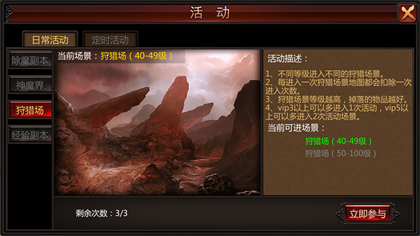 还有一个获取装备的好去处便是【场】,这里是游戏中BOSS怪物的集中地,玩家可从活动面板中选择进入。不同等级的玩家只能进入与自己等级相匹配的【狩猎场】。随着等级的提升,掉落的物品也会愈加优质。每次进入【狩猎场】场景地图都会消耗一次进入次数,狩猎场中设有三层地图,玩家可通过传送阵来回穿梭,点击离开后即可退出狩猎场景地图。