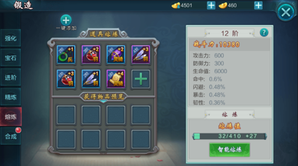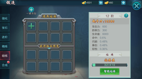 3、单击熔炼物品栏中的装备,熔炼后将获得对应的熔炼值,熔炼值满时,可获得永久属性加成。