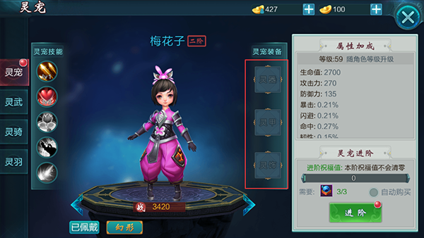 2、灵宠阶数越高,可穿戴的灵宠装备阶数亦越高;