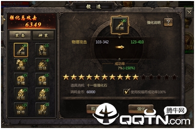 消耗强化石和金币来强化和英雄的装备及神装部位,永久提升属性。