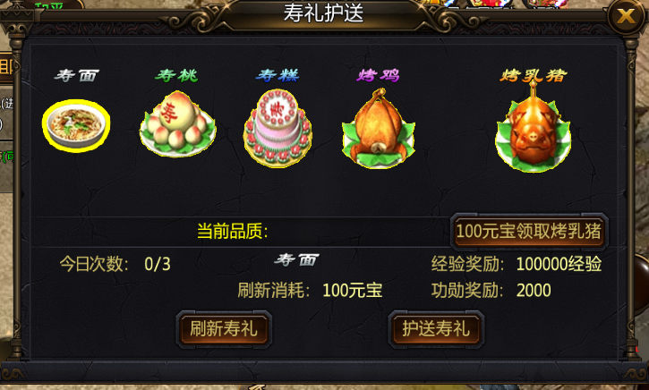 押运要领一:寿礼需刷至最高级的烤乳猪方可领取。在《沙城争霸》中,我们自然希望每一次任务的收益达到最佳。而城主贺寿的最高等级便是烤乳猪,唯有这样才能获得最丰厚的奖励。刷新寿礼需消耗刷新符,该物品可在商城中购买。