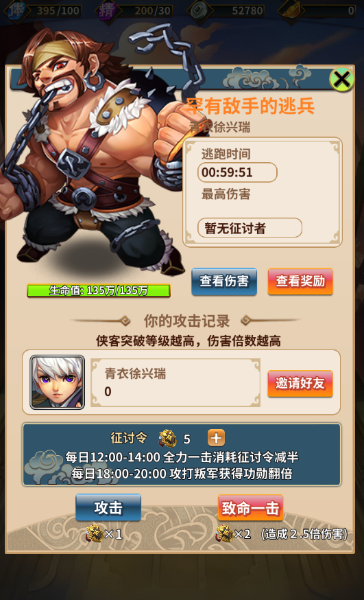2.每次攻打叛军需消耗一个征讨令,玩家亦可选择消耗两个征讨令以获得2.5倍的攻击效果。征讨令的上限为10个,每小时恢复1个。
