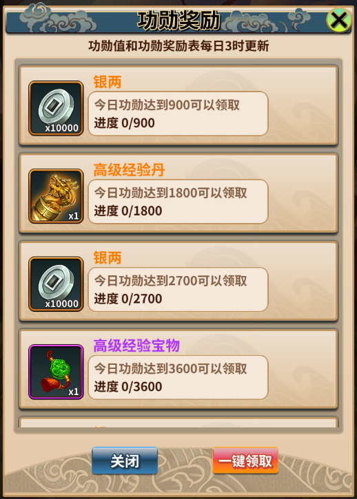 1.成功攻打叛军后,玩家可获得功勋值,每日功勋值累计达到一定数值后可领取元宝、银两、天命石、经验丹及其他丰厚奖励。随着角色等级的提升,功勋奖励的种类也将不断增加。
