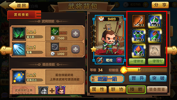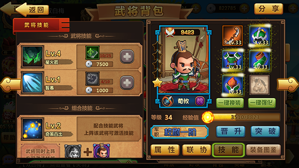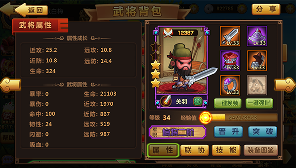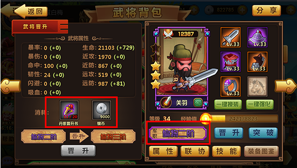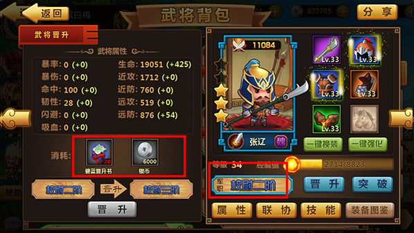 武将需要、晋升、突破、提升技能以及穿戴装备。