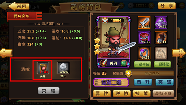 【突破】需要武将碎片,集齐一定数量的武将碎片即可进行突破,提升武将星级。