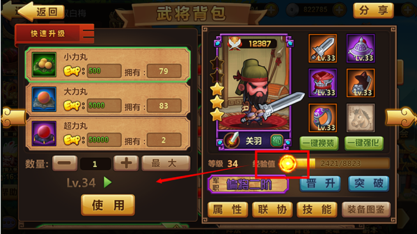 武将等级可通过战役关卡获得经验,从而提升等级。也可以使用武将经验类道具进行提升。