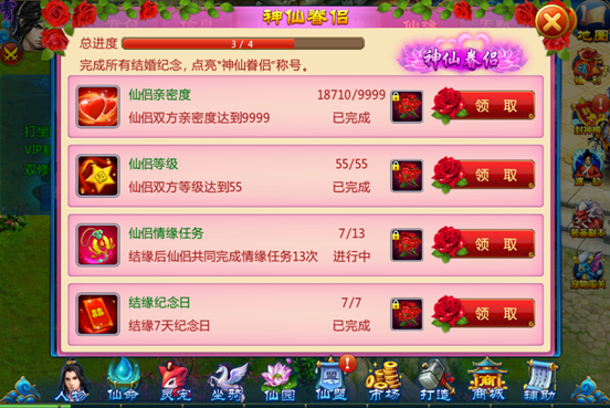 1) 完成所有结缘纪念可点亮“神仙眷侣”称号,装备该称号可获得生命属性+1500。