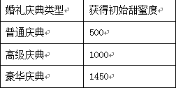 1) 双方初始的甜蜜度为庆典结束时的甜蜜度,若不举行庆典,初始的甜蜜度为0,若举行庆典,则根据庆典类型在庆典结束后赠送不同的甜蜜度。