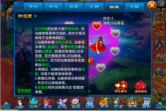 5) 离婚后,双方的仙缘值与亲密度会被清空,但仙缘的修炼效果将保留(即属性保留),但无法继续修炼,再婚后可恢复修炼。