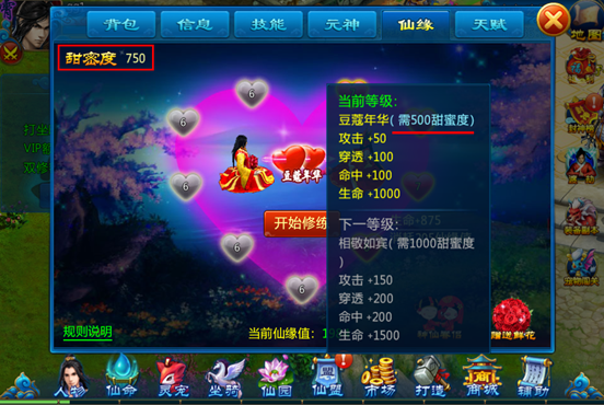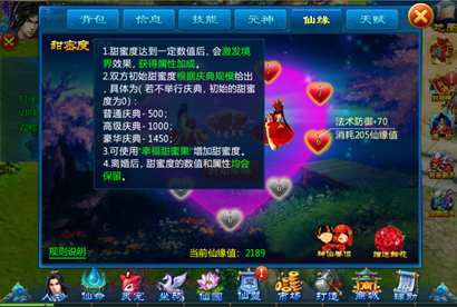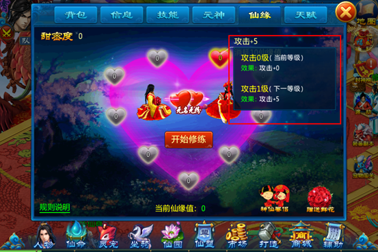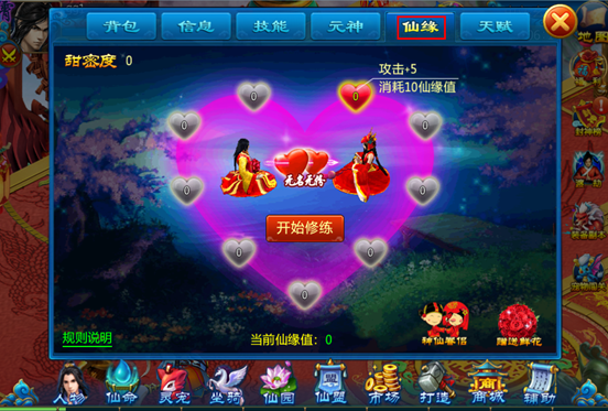 2) 仙缘修炼所需的仙缘值来源于结缘后,双方的亲密度即为初始仙缘值,结缘后每增加1点亲密度,双方均可获得1点仙缘值。