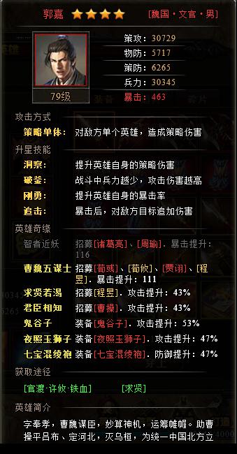 郭嘉,单体伤害爆棚的黄金脆皮鸡,犹如上的郭嘉,游戏中他的生存能力同样不堪一击,若不加以保护,极易遭遇不幸,但这并不妨碍他的强大。策攻成长高,奇缘可开启六条,其中四条加攻击,技能各具加伤效果,被培养成型的郭嘉一旦发力,必将令对手心惊胆战。然而,他的短板也显而易见,打闪避却不够给力,生存能力弱,推图难以轻松拿下三星通关,这柄双刃剑,唯看各位如何使用。