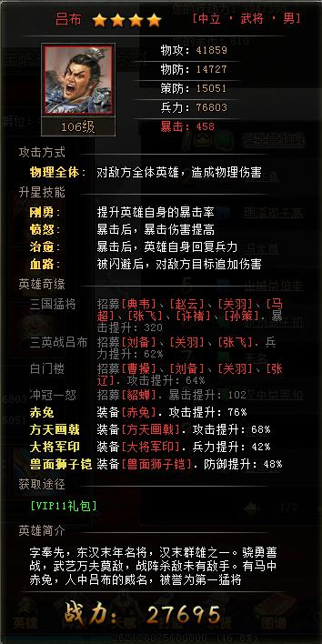 吕布,暴力群杀的无双战神。马中赤兔,人中吕布,演义中三英战吕布,方能稍占上风,游戏中吕布同样是一位强大的群攻将。全体攻击将常常被视为猪队友,因其伤害偏低,然而吕布在成长后攻击可达四万之高,血路技能完克闪避,若敌方试图闪避,他绝不会手下留情,经过几次闪避后,后排脆皮将早已被轰杀殆尽。成型的吕布,其双抗与兵力均可达到前排武将的水准,实在无可挑剔。
