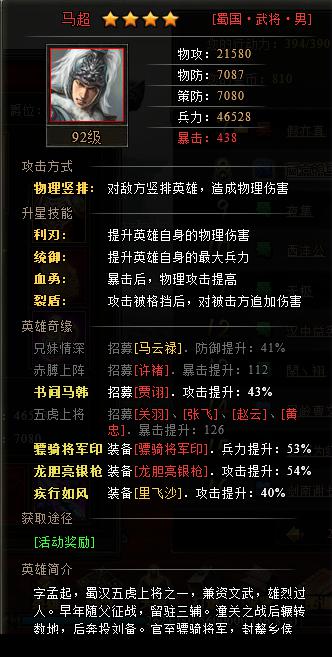 马超,入手即飞的隔壁老王。作为暴击将,他拥有一个提升兵力的技能与一个加兵力的奇缘,因而生存能力相对较强;竖排攻击方式搭配不俗的攻击力,让他轻松潜入敌后,关键是你无法阻挡他,若你试图抵挡,马上又会被他再度打击,我只能感叹,前所未见的厚颜无耻之人;充值500即可获得四星,条件允许的情况下,直接入手便能掌握赵云与马超,奇缘也容易开启四条,这才是真正的入手即飞。