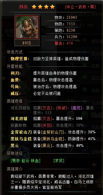 颜良,平民小关羽,曾因被关羽斩首而从此崛起,习得关羽的威压,攻击闪避能力极佳,属性表现亦属红将正常水平,攻击方式为竖排,表现相当出色,尽管攻击对后排伤害有所衰减,但后排将普遍较为脆弱,被暴击一击仍难以承受。值得一提的是他的号角技能,搭配张春华与华佗将获得可观收益,关卡也易于通关,奇缘易于开启,经过合理培养可谓牛逼一时,但也存在劣势,三件金色装备注定了他在后期精炼时代的悲剧。