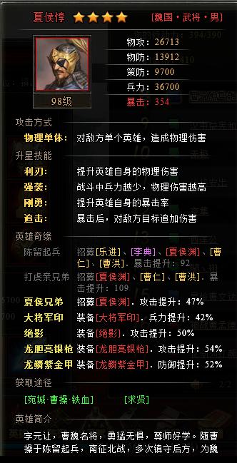 夏侯惇,屌丝逆袭之第一将,单体输出的优势不言而喻,伤害高于群攻将,避免了给敌方多个目标闪避回血和格挡反击的机会。四个技能各具狂暴,成长也颇为可观,奇缘可开启五条,关键是他还是玩家在推图时能轻易刷到的首个红将,奇缘也不难获得。只是将魂掉率略低,刷起来略显吃力,不过好马难驯的道理大家都懂。若手中没有关羽、周瑜,推荐先刷这位让人又爱又恨的独眼龙。