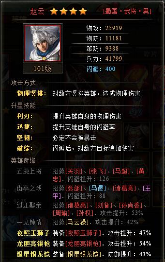 赵云,进可攻退可守的万年男二号,作为闪避将,他的攻击伤害颇为可观,闪避后对敌人追加伤害同样不容小觑,然而他却显得低调,总是为了荀攸、张辽、华佗的阵容而存在。若想玩闪避流,最好是V5以上。尽管他也有自己的局限,双防与兵力均属普通,奇缘仅能开启四条,虽免疫暴击,但仍无法改变他命运多舛的局面,通常大R玩家并不看好他,因为有更多选择,而小R玩家则依然可以利用他。