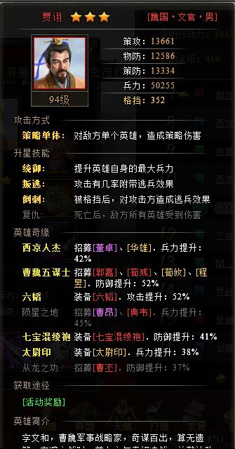 贾诩,慢热的毒士,个人认为贾诩的设计相当契合他在演义中的。虽然始终不甚出彩,但他能活到曹丕称帝,身居高位,非同寻常,游戏中他并无爆发,但每回合均有稳定伤害;他可开启六个奇缘,三个加兵力两个加防御,生存能力较强,正如他在历史上追随众多主公,始终不离不弃,可靠的存在。他并非最强,但却具备独特的特征。
