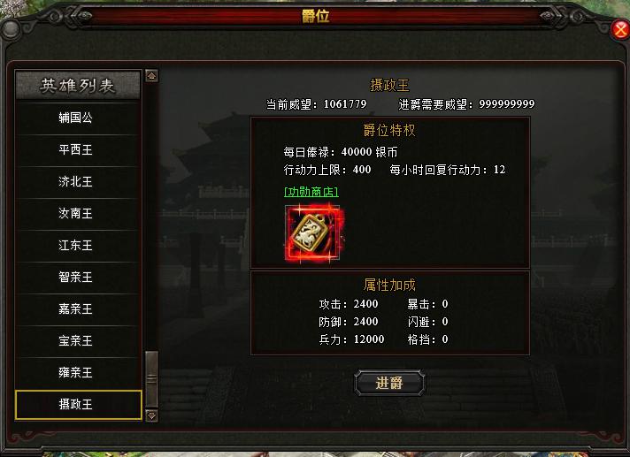 2.爵位需消耗威望,当威望达到升级要求后,点击爵位界面的进爵即可。