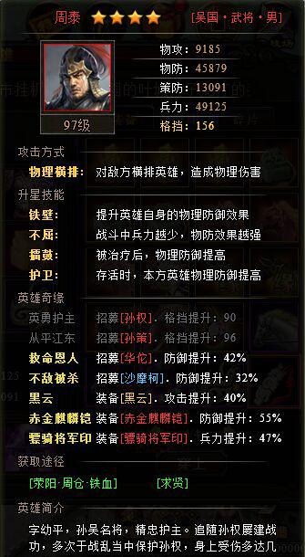 周泰,刀枪不入的物防怪兽。只需一张图便可说明一切,话不多说,四万的物防,你有几个将的物攻可以达到其高度?物攻将对他而言不过是挠痒,搭配华佗与张春华的回血,他的物防可达到惊人的数值,连关羽、张辽与吕布这样的物攻将也只能望而却步,其他物攻将更是无从提及。他自带物防光环,堪称一人参军,全家光荣。在物攻关卡中抗怪也是游刃有余,但策防表现并不突出,典型的“不怕菜刀也怕老鼠药”。刷魂关卡的难度稍高,但奇缘装备并不难获得,推荐在后期人手一位。