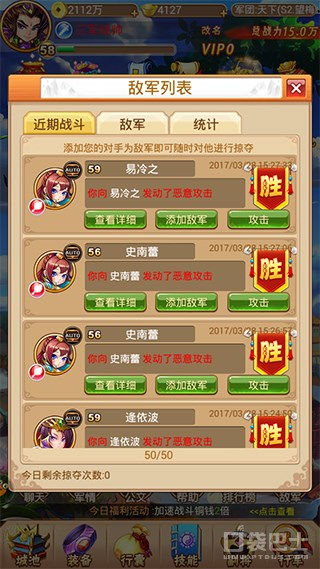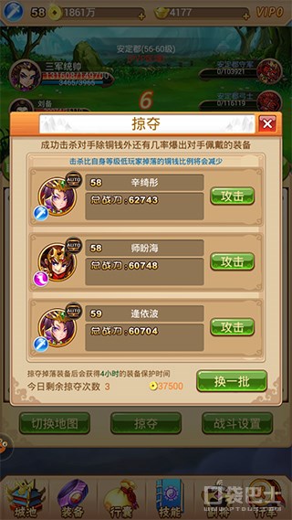 在《开心挂三国》中,玩家每天可获得3次免费掠夺机会,使用这些机会可对PVP地图及敌军系统中的玩家进行掠夺。如果每日的免费掠夺次数无法满足需求,玩家还可用元宝购买额外的掠夺次数。当然,掠夺并非单向,被掠夺的玩家若心有不甘,也可通过敌人系统进行报复。