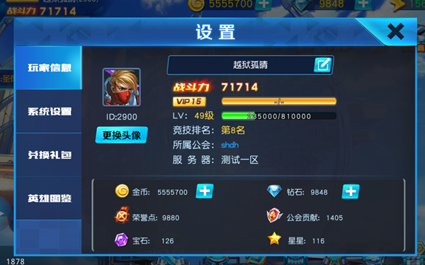 设置系统涵盖玩家信息及系统配置等功能,玩家可根据个人喜好进行调整(如声音与音效的开启),兑换礼包,此外,英雄图签亦可为属性带来增益。