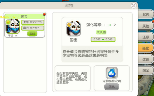 宠物强化可提升宠物的成长值,成长值将影响宠物升级所获属性,成长值与宠物档位相辅相成,偷偷告诉你,它们之间是相乘的关系哦,因此若有心仪的宠物,请尽快为其强化吧!