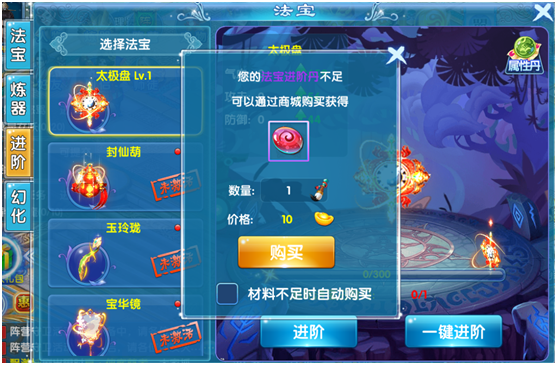 法宝进阶所需的进阶丹将在商城出售。