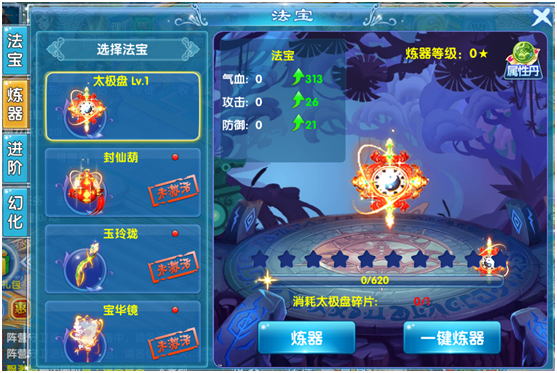 当法宝达到一定等级后,玩家可以通过炼器进一步提升,从法宝-炼器进入