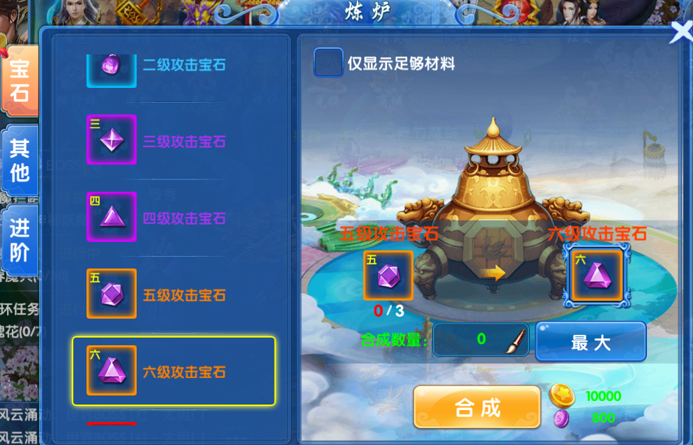 四颗属性相同的宝石可合成一颗更高级的宝石;