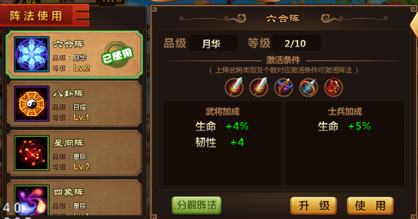 阵法等级通过操练值进行,操练值可使用银币和元宝进行吸收,达到满值后阵法将升级,升级后相应的加成属性也会随之增强。