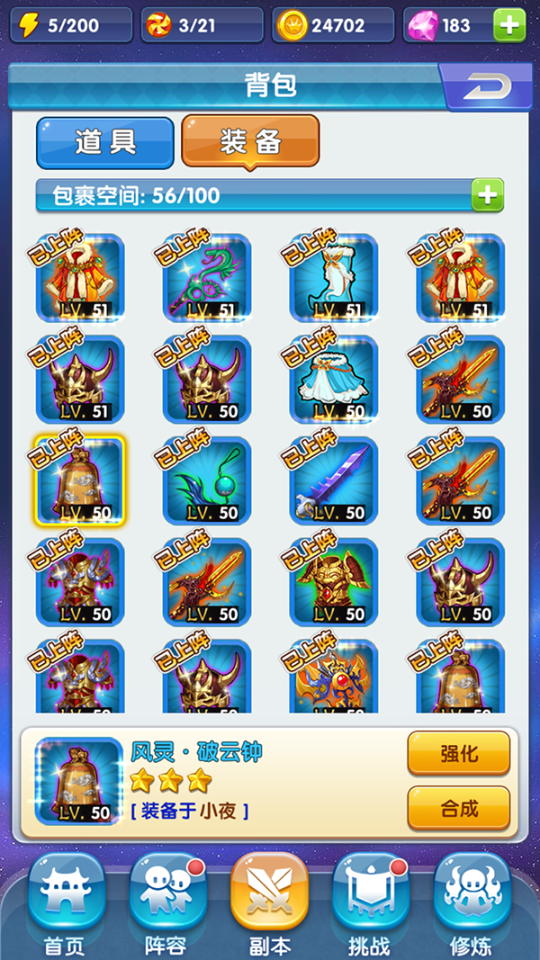 玩家可通过花费金币进行装备强化,强化后的装备将大幅提升相应的属性。装备强化等级不得超过主角等级的两倍,亦可通过“强十次”的方式快速强化。
