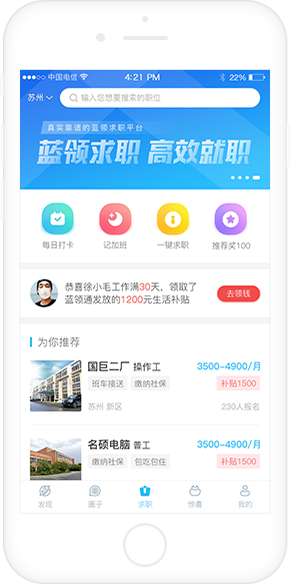 同时,在蓝领通圈子社区,蓝领用户可获取各类生活与就业资讯、法律知识及法律援助,亦可交友与组织丰富多彩的活动。