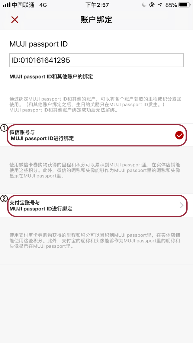您可以在MUJI Passport应用中,将MUJI Passport ID与您的微信账户和支付宝账户进行绑定。绑定后,您的MUJI里程及积分将自动合并。