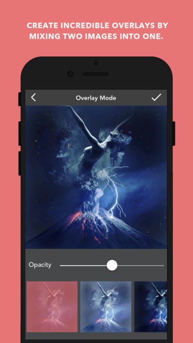 VERLAY MODE(双重曝光)——通过叠加模式,将两张来自相机或相册的图像融合,创造出透明或双重曝光的效果。你可以灵活调整不透明度,轻松为叠加图像增添各种效果,包括:倍增、屏幕、变暗、减轻和覆盖。