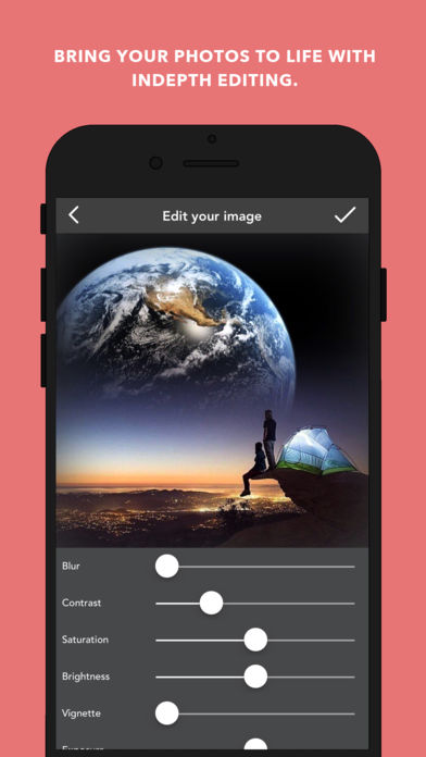 印刷术——借助我们简便的文本功能,为你的照片添加优美的字体。超过100种独特的自由选择字体供你挑选。你可以轻松添加多个图层,并随意编辑它们的大小、位置与颜色,也可调整不透明度与阴影。