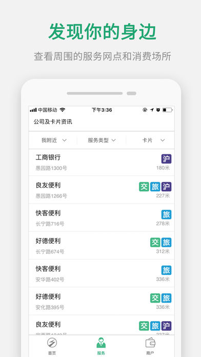 “”功能:可精准获取您附近的交通卡、旅游卡及ETC沪通卡服务网点。