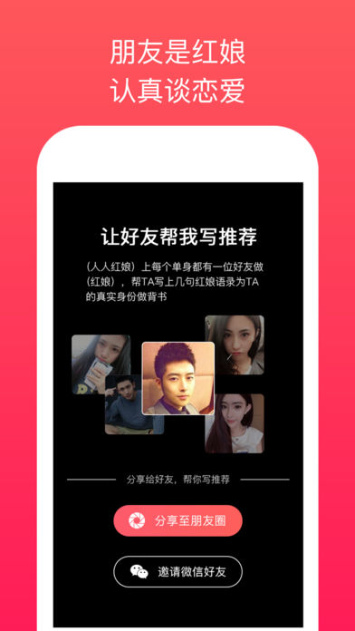 人人红娘s版旨在通过熟人之助,解锁单身困境,分享您身边的单身好友,传递好友动态,为朋友架起二度人脉的桥梁,助您尽快邂逅命中注定的TA。