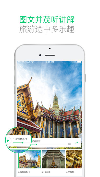 通过GPS与微定位技术,实现游览景点时随时随地的语音讲解,仿佛专业导游伴随左右。目前已覆盖全球数千个景点(如吴哥窟、卢浮宫、故宫、大皇宫玉佛寺、巴黎圣母院、奥赛博物馆等),成为旅游必备的语音导游软件。