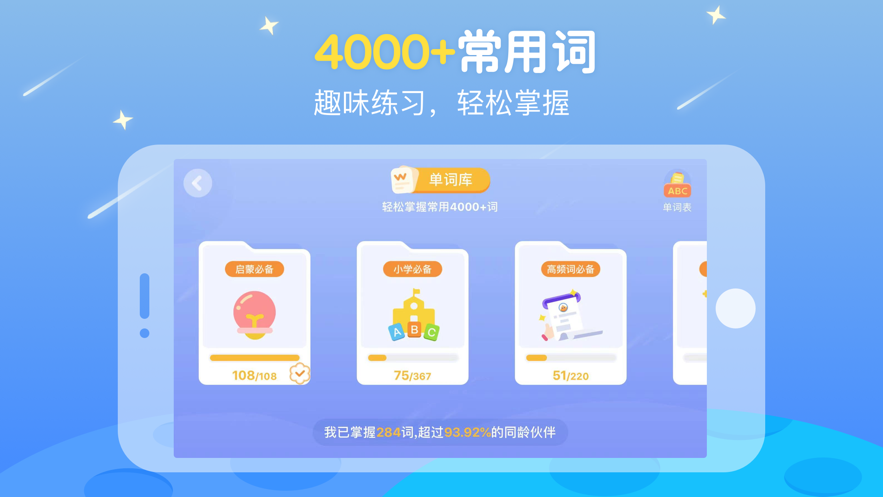 ABC Learning涵盖108词、220高频词、300+小学词库、1000+K词库及2000+词库;更有2000+拓展词库。通过“学、练、认”科学的学习路径,高效掌握4000+常用词汇。