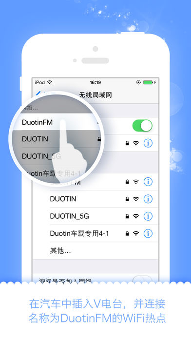 步骤 3:上车后,连接WiFi以接入多听 · V电台热点;