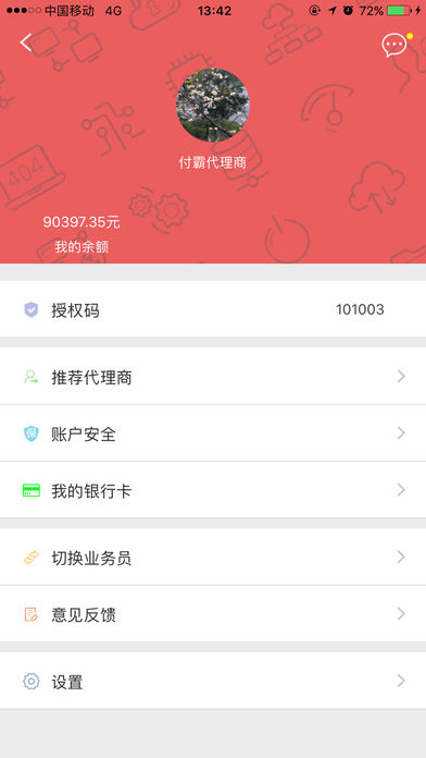 我的:代理商的个人中心,可查看与编辑个人信息,查询代理商余额,修改登录密码,切换业务员等