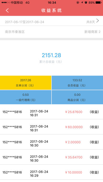收益系统:统计用户在代理商签约商户下消费所产生的收益情况