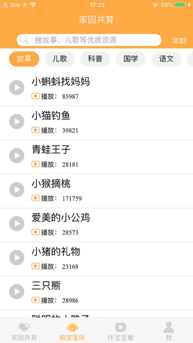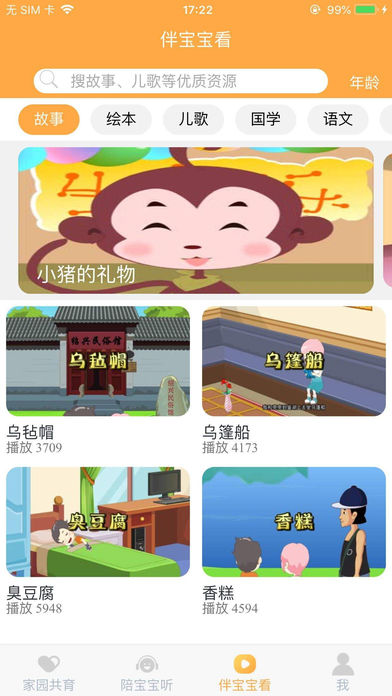 幼教云故事陪伴是专为0-6岁儿童打造的早教资源平台,汇聚了故事、绘本、儿歌、国学、英语以及等优质早教资源,与爸爸妈妈们共同陪伴宝宝。