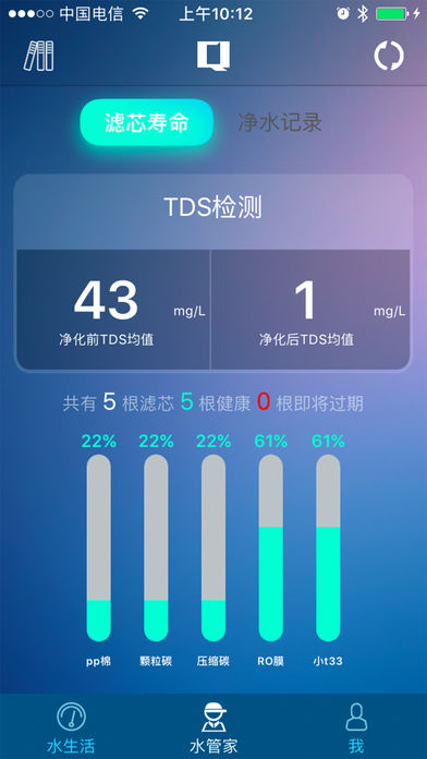 千千泉水管家App通过与净水设备的高效连接,实时反馈TDS数值、滤芯寿命等相关数据信息,让您轻松掌握净水器的工作状态。