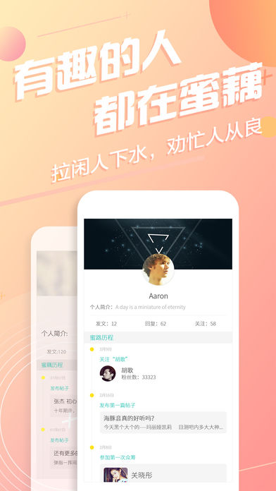 蜜藕APP是一款娱乐软件,集结各种明星资讯,组建各种兴趣圈子,线上线下活动一手抓,交友、畅谈、众筹、互动无所不包!