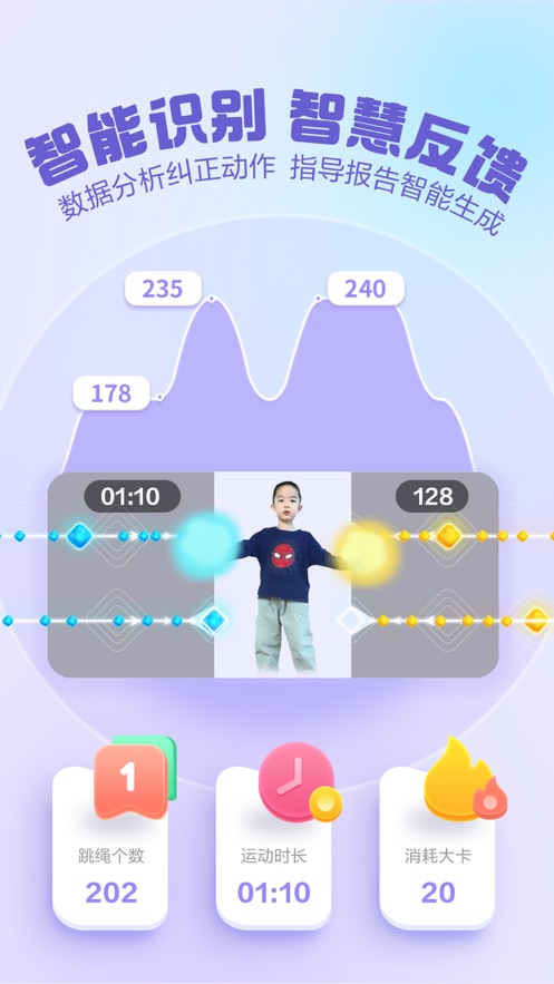 可根据个人需求,选择计数、计时、热量消耗和自由等四种跳绳模式,帮助孩子达到青少年体测标准。自动计数功能令跳绳更为轻松,亦可将视频成果分享给朋友们。此外,还有、小橙酷跑、躲进盒子、音乐星球等多样运动形式,趣味无穷。