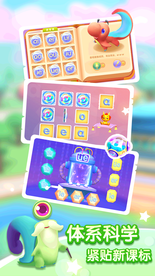 - 21节3D拼音互动动画课程,让孩子扮演故事主角,融入拼音语境学习环境,欢乐领悟拼音。
